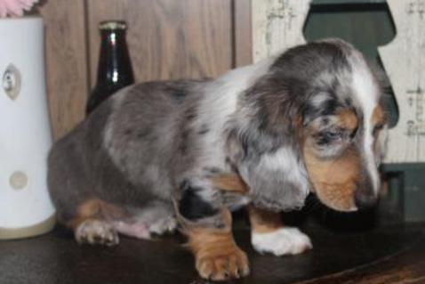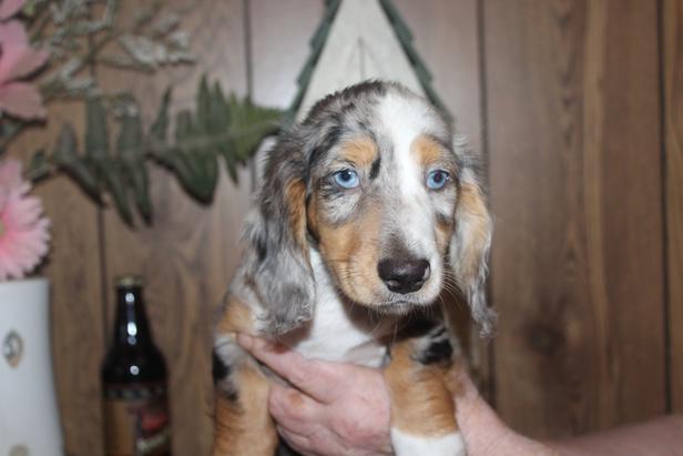 Personality: This double dapple male Dachshund puppy is the total package—super friendly with a “million-dollar” personality. He’s confident, affectionate, and loves being part of whatever you’re doing. With his striking double dapple coloring, blue eyes and sweet expression, he turns heads everywhere he goes, but it’s his lovable nature that truly steals the show. He enjoys attention, thrives on companionship If you’re looking for a playful, people-loving pup with an unforgettable personality, he’s your guy.